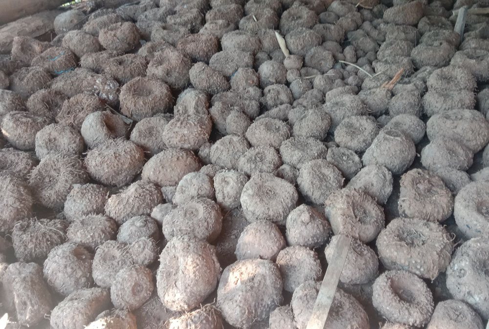 Katak merupakan bintil yang tumbuh pada pangkal atau tangkai daun, biasanya berwarna coklat kehitaman. Katak dikumpulkan ketika panen, lalu disimpan sampai musim hujan datang. Ketika musim hujan datang, katak langsung ditanam pada lahan yang disiapkan.